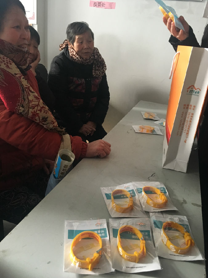 活动现场,社区居委会配合市福彩中心工作人员为老人们发放定制黄手环。